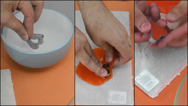 Me calienta un cortador de galletas de metal en un recipiente de agua caliente y corta un corazón de plástico.