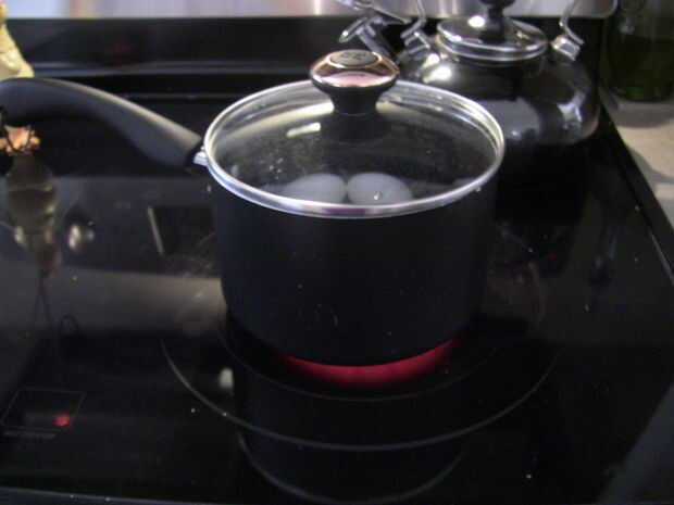 Espere hasta que el agua hierva luego apaga el fuego y dejar que los huevos reposar en agua caliente unos 10-15 minutos.