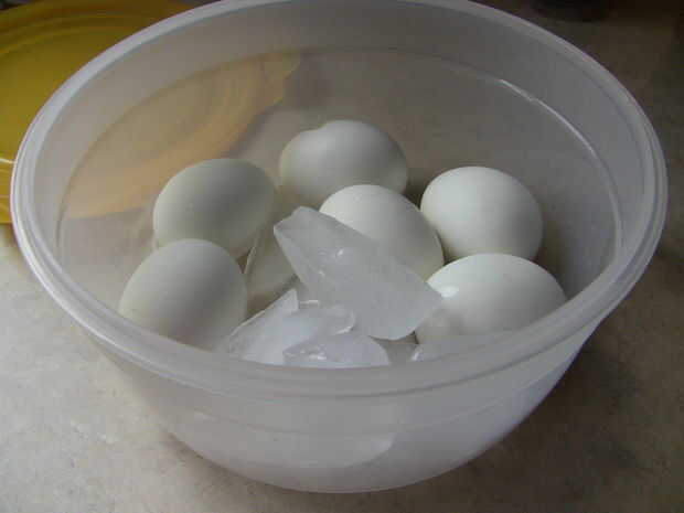 Una vez que los huevos han sido sentados en el agua, vaciar el agua caliente hacia fuera y pones huevos en el contenedor con hielo.