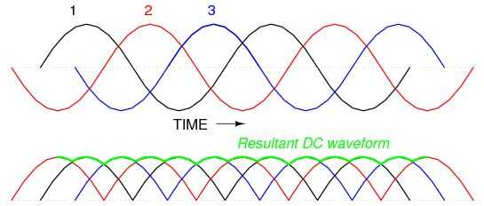 Básicamente un rectificador elimina el ciclo negativo de la AC, por lo que en principio podemos conseguir un resultado mucho mejor si hacemos rectificación otra vez. Hay dos tipos básicos de rectificadores de fase tres, 6 rectificadores de pulsos y 12 rectificadores de pulso. Ambos se muestran aquí abajo.