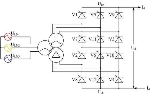 Rectificadores, circuitos de rectificador de seis pulsos todavía producen distorsión armónica considerable en las conexiones de la CA y CC. De muy alta potencia rectificadores generalmente se utiliza la conexión de puente de doce pulsos. Un puente de doce pulsos consta de dos circuitos de puente de seis pulsos conectados en serie, con sus conexiones de CA alimentados desde un transformador de la fuente que produce un desfase de 30° entre los dos puentes. Esto anula muchos de los armónicos característicos que producen los puentes de seis pulsos.