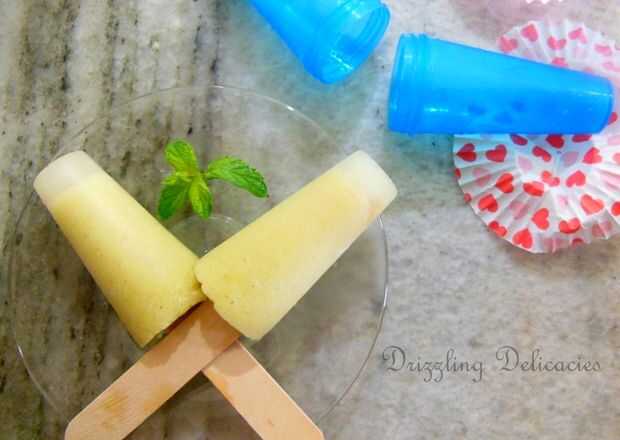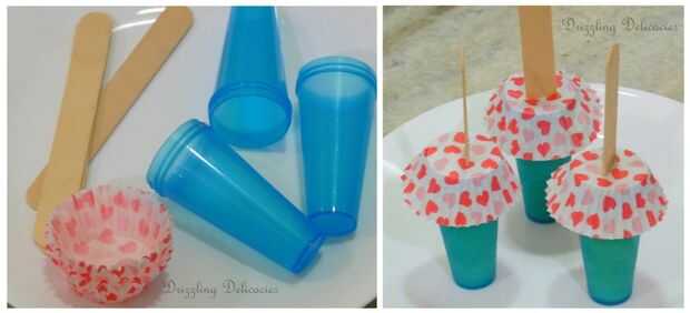 Verter en moldes de paletas y descansar durante la noche. He utilizado vasos de papel aquí para apoyar los palillos.
