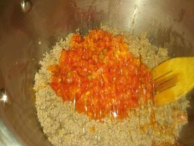 Siguiente paso. Queremos que el sabor de la carne. Y para ello no vamos a utilizar el agua. Vamos a usar el jugo de los tomates enlatados.