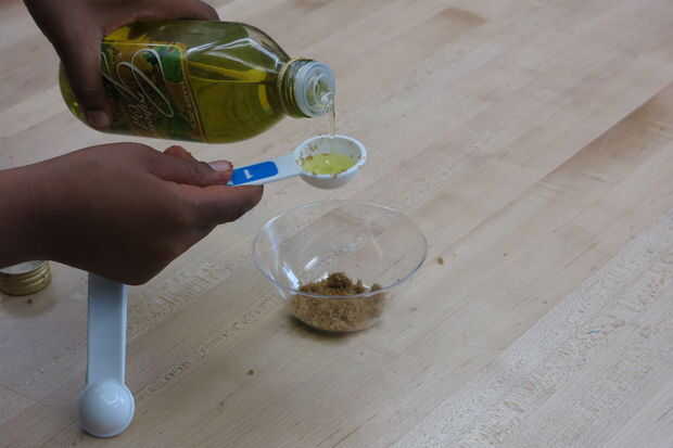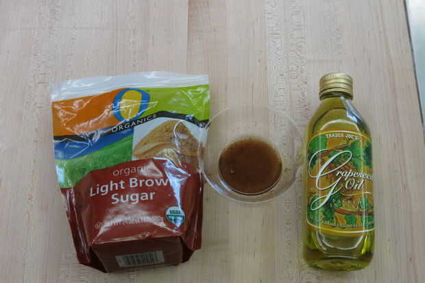 1. Mezcle el aceite de uva y azúcar en el tazón de fuente usando el dedo o una cuchara para revolverlo.