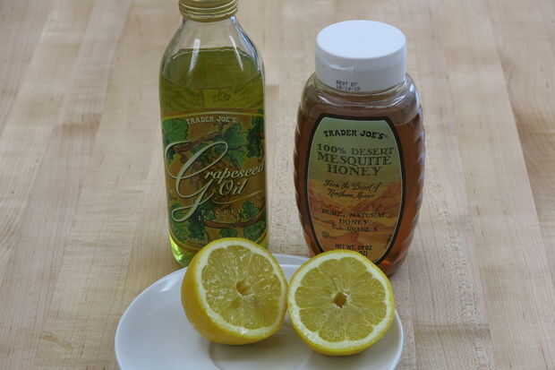 1. Mezcle el aceite de semilla de uva y la miel juntos en el recipiente con su cuchara meneallo.