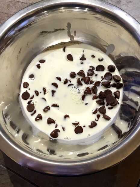 Calentar la crema de leche en la tapa de microondas o estufa a fuego lento. Verter sobre el chocolate y déjelo reposar uno o dos minutos. Esto derretirá el chocolate para que cuando se agita se vuelve una ganache de chocolate espesura.