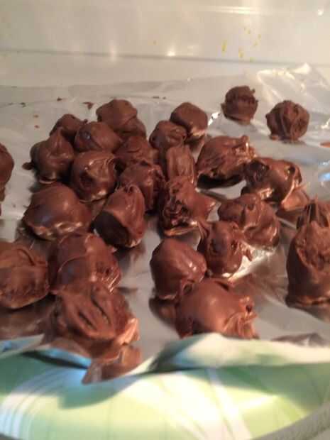 Mientras que las bolas firme respaldo, derretir el resto chispas de chocolate en el microondas durante 30 segundos en alta. Revuelva y repita hasta que el chocolate esté derretido y suave. Usando un palillo o tenedor, sumergir cada bolita en el chocolate y rápidamente el rodillo para cubrir de chocolate. Retire y coloque sobre papel papel o pergamino y enfriar.