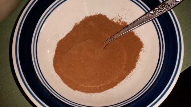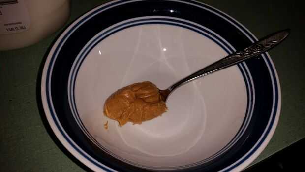 Tomar una cucharada grande de PB en un bol. Yo uso un tazón de cereal de tamaño pero lo que flota su barco chocolate a tierra feliz. Scoop es alrededor de 1/3 de taza.