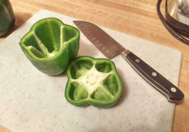 Rebanada de la parte superior de tus pimientos y quitar la pulpa y las semillas del interior.