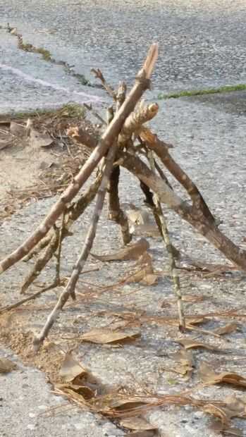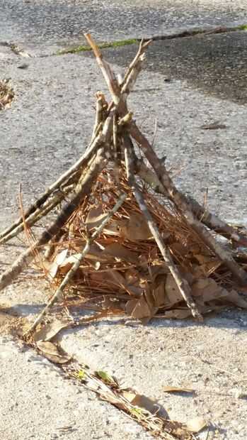 Primero apuntalar algunas ramitas y apoyarse uno contra el otro inclinado hacia arriba. Entonces ponga usted es inflamación y seca hojas dentro. Entonces la luz. Es cómo hacer una fogata de tipi.