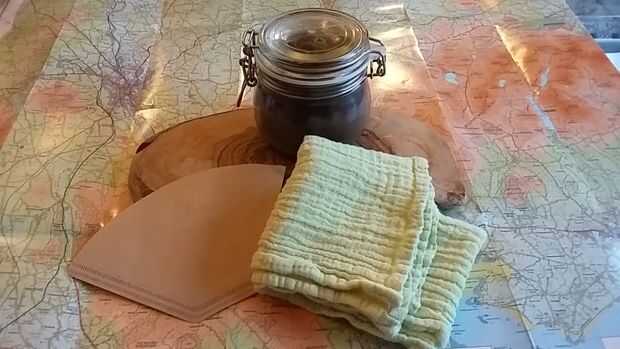 1 filtro (tienda compra filtro de papel o una muselina, usted incluso podría cortar encima de una camiseta vieja)