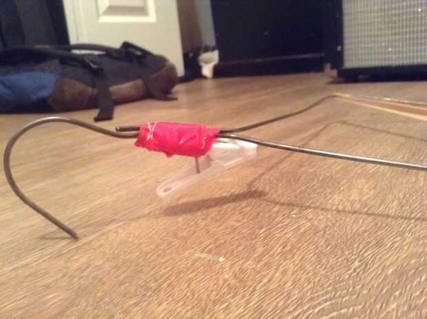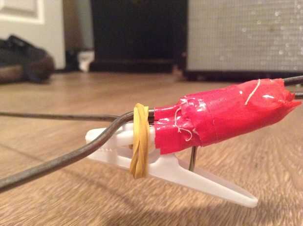 Su pinza para la ropa será el gatillo. Deben fijarse con cintas o bandas elásticas para el espacio justo debajo del gancho (que ahora es el mango) con la parte que los pernos hacia abajo mirando hacia afuera.