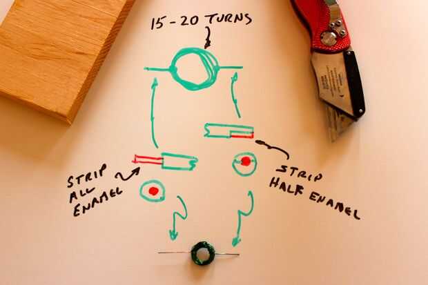 El aislamiento de esmalte se debe retirar completamente de un árbol y mitad quitado en el otro como se muestra en la figura. Una navaja o cuchillo funciona bien – sólo tenga cuidado de no nick demasiado el cable. Una vez que el aislamiento es despojado Compruebe la armadura para el equilibrio en los ejes. Un poco manipulación de los cables del árbol generalmente conseguirá un equilibrio bastante bueno.