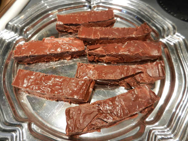 Paso 1 En un recipiente de microondas seguro derretirá 6 oz de la capa de caramelo de chocolate y revolver hasta que esté suave. Esparcir uniformemente en un molde engrasado pergamino forrado. Refrigere hasta que cuaje (unos 5 minutos).
