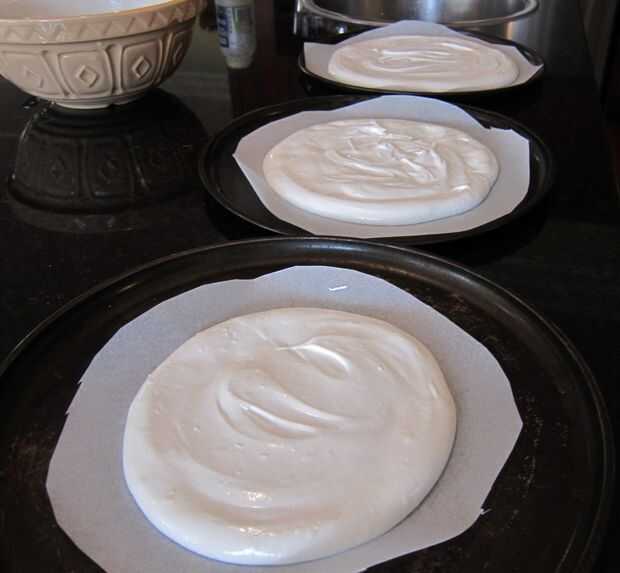 A continuación utilizando la cucharilla espátula la mezcla sobre los círculos de papel impermeable a la grasa. Extiende la mezcla sobre el papel a las dimensiones de cada uno de los círculos. Trate de asegurarse de que cada capa es aproximadamente la misma altura. Poner a las pavlovas en el horno precalentado y hornear durante unos 30 minutos. Debe ser duros en la parte superior y un poco de color pero correosos en el medio.