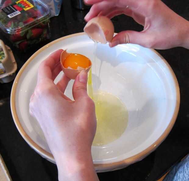 Separar 6 huevos y añadir las claras a un bol grande. A continuación batir los huevos con una batidora eléctrica hasta que se ha vuelto blanca y esponjosa (ver video). Ahora poco a poco agregar el azúcar mezclando a medida que avanza (es práctico utilizar una espátula para mezclar en los bordes). Una vez que se ha combinado el azúcar agregar la harina de maíz durante la mezcla. Continúe batiendo hasta que la mezcla puede formar picos blanco sólidos (ver video).