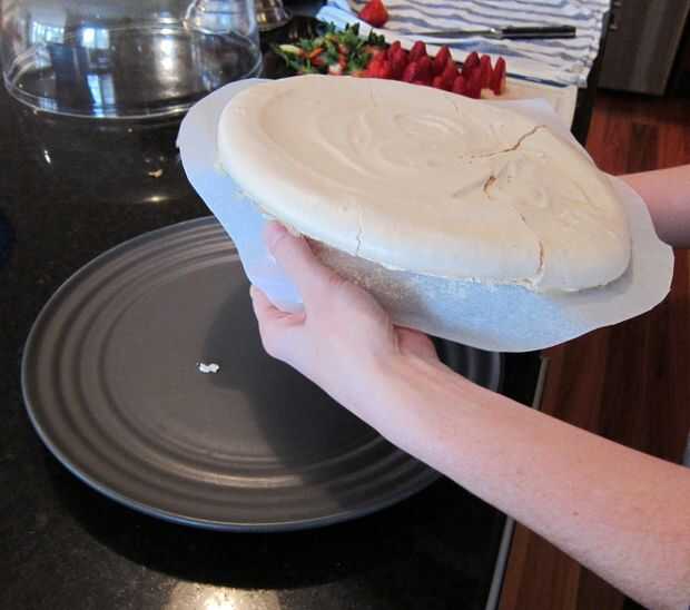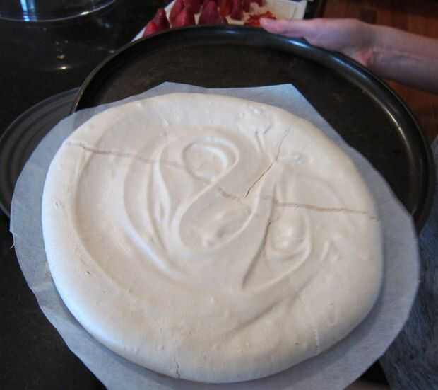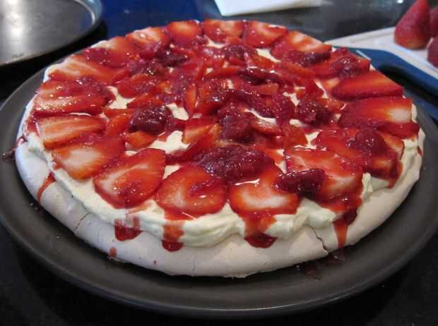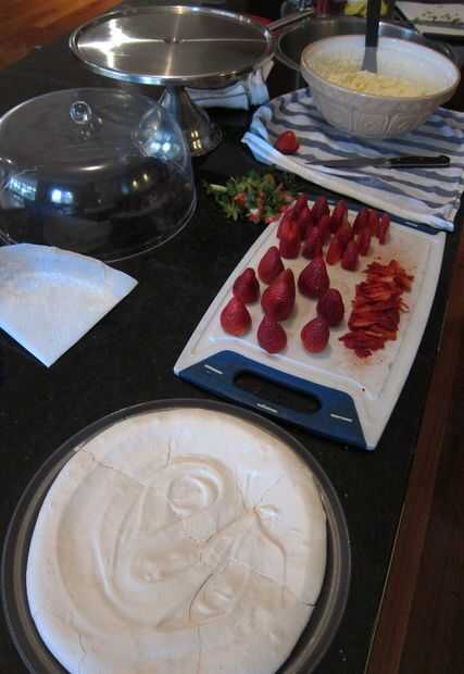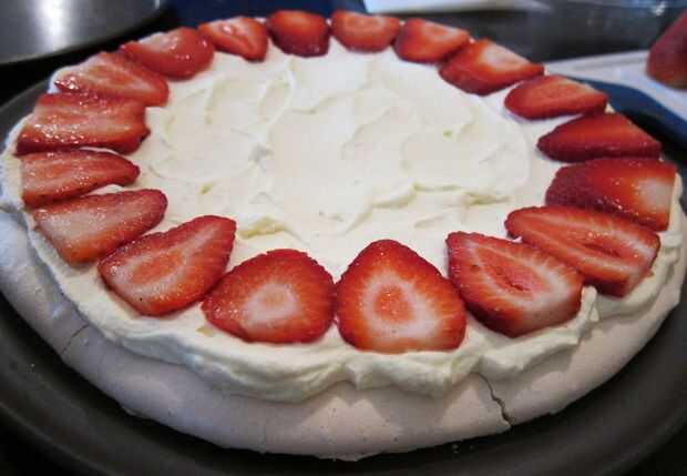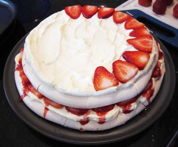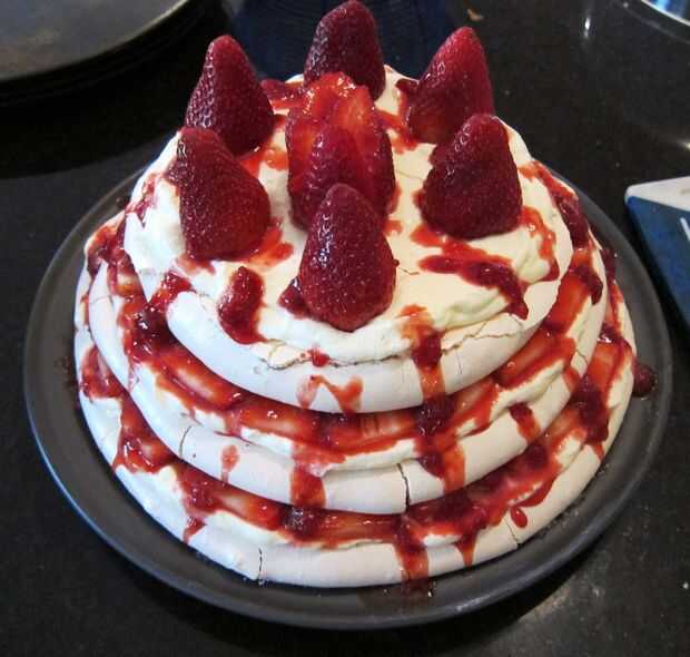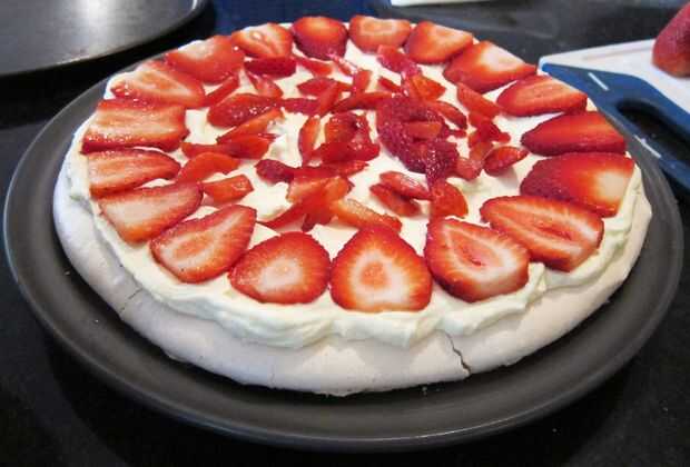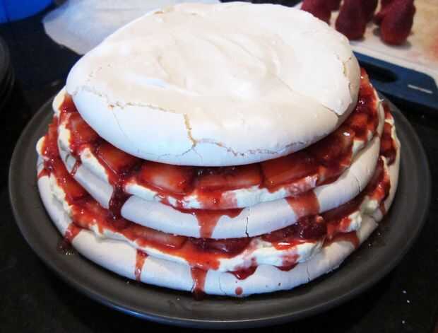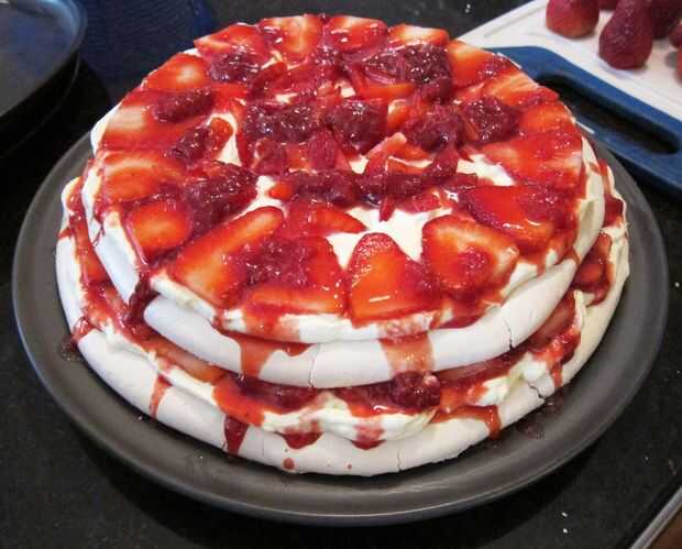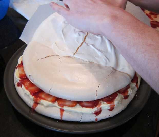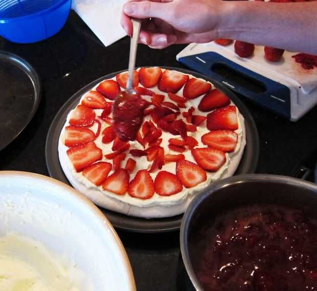 Asegúrese de que cada capa de la pavlova cocidos se haya enfriado. Tomar la capa más grande y cuidadosamente retire el papel de la hornada de la parte inferior y colocar en un plato grande. Con el cuchillo de hielo, agregar una capa de la crema batida, asegurándose de que se extiende uniformemente. Añadir las rodajas de fresa alrededor del borde de la capa luego coloque la fresa picada en el centro. La salsa de fresas refrigerada y añadir gotas de él alrededor del centro y los bordes de la capa.