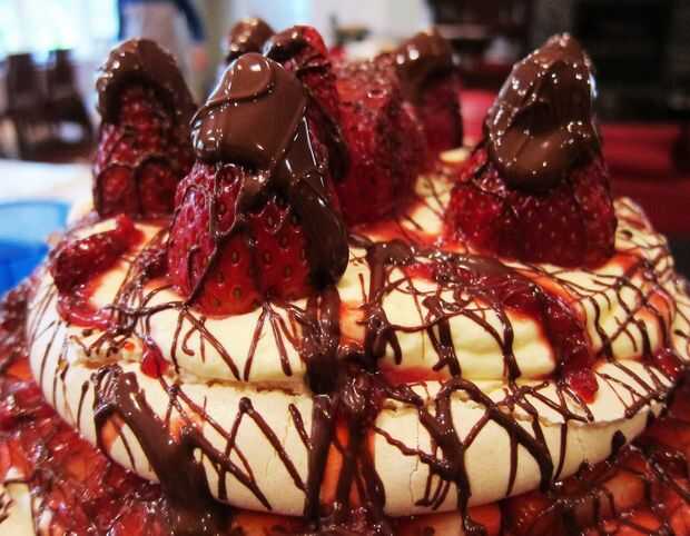 Tomar chocolate oscuro derretido y añadir gotas de la it en la parte superior de las fresas enteras. Con el resto de la película chocolate derretido sobre la parte superior de la pavlova, asegúrese de girar la pavlova y agregar líneas de cada dirección.