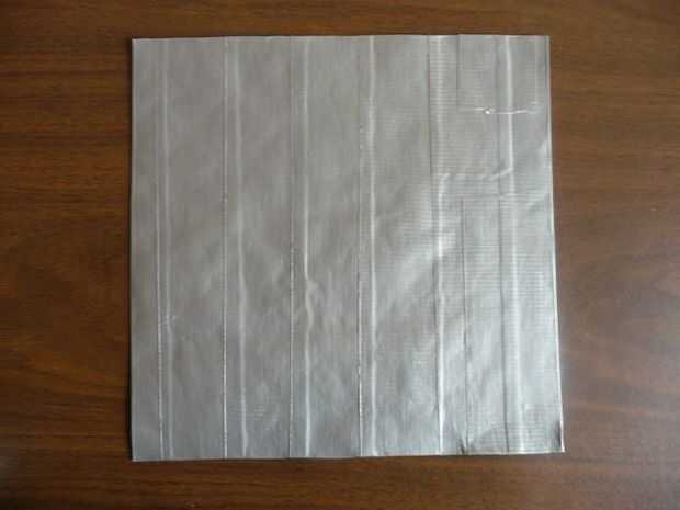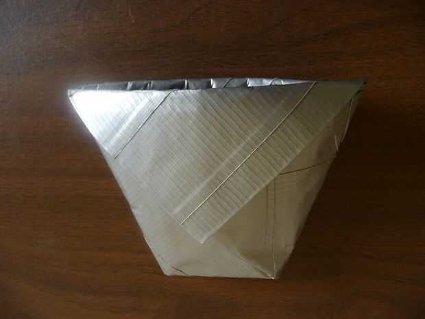 En la foto a continuación es las Copa dobladas/tazas y las tazas acabadas después las costuras exteriores fueron selladas en la cinta del conducto.