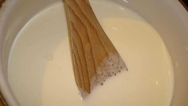 Retire la cacerola de la estufa. Asegúrese de que no esté muy caliente antes de añadir el arrancador de yogur.