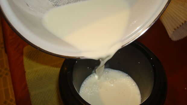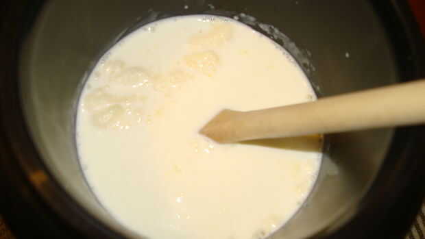 Después de haya alcanzado temperatura ambiente Vierta la nata en una cacerola y calor con cuidado encima de la estufa a fuego bajo a no más de 100 grados. No quiere matar a la cultura. Que quieras sobre temperatura de la botella de bebé.