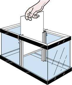 La instalación fue bastante simple. Recortar los paneles divisorios para montar, poner los canales laterales en los paneles divisorios, ajuste los canales del estabilizador en la parte superior e inferior, deslice todo el conjunto en el tanque, luego ajustar los sujetadores sobre el exterior del tanque y en los canales para mantener los paneles en su lugar.