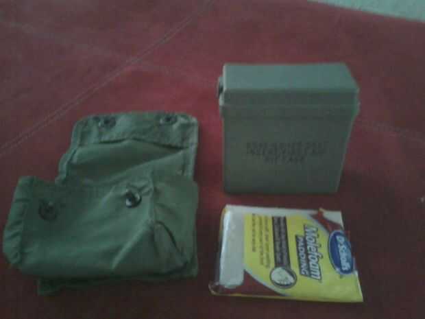 Este primer kit que compré de un amigo y vino con el material habitual de los militares. Vino con los ganchos ALICE para conectar a la unidad, botiquín de auxilios de los abetos de plástico y luego he añadido algunos espuma mole para ampollas.