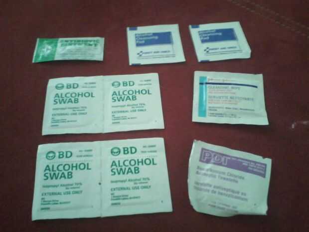He guardado las almohadillas de alcohol que vinieron con el kit y agregan más. Nunca sabes cuando te necesite! También he añadido una pomada anti biótica.