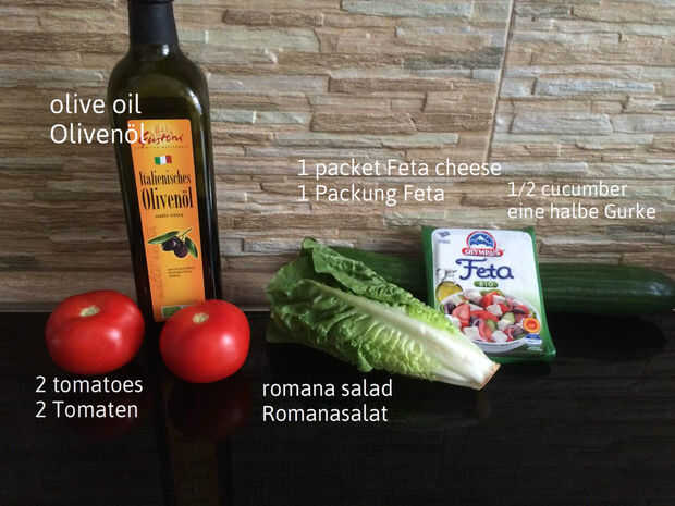 Como se trata de una ensalada, más o menos puede tirar cualquier cosa aquí. Aceitunas, bell peppers, aguacate - nada. Esto es sin embargo más simple. Se alimenta a de 4 personas.