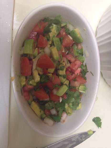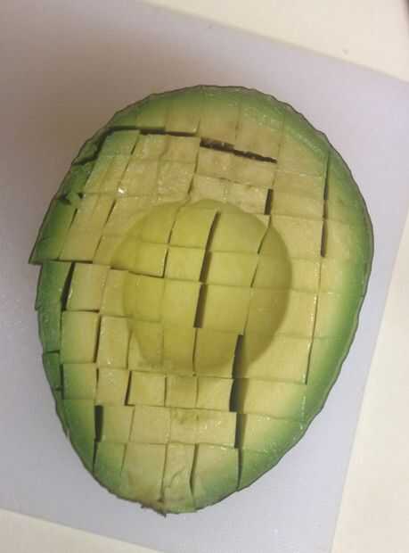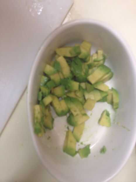 * Nota * un truco simple para cortar aguacates es cortar una mitad y dados dentro de la piel como se muestra en la foto. Luego colocar la parte picada.