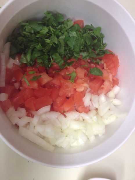 Finalmente picar media taza de cilantro. Coloque el bol para mezclar junto con la cebolla y los tomates.