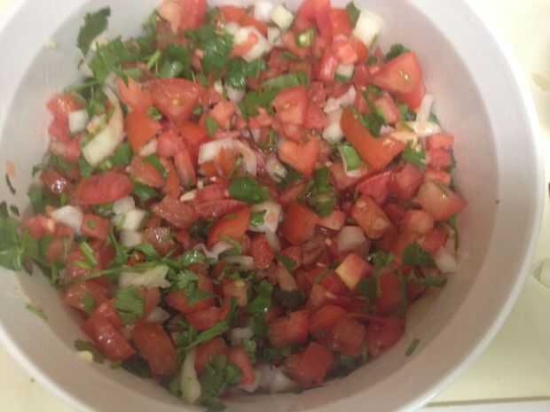 ingredientes:-4 tomates grandes maduros, sin semillas y picado-1/2 taza de cilantro, waashed y picadas-2 dientes de ajo-1 cebolla roja pequeña-1 cucharada de jugo de Lima fresco-caliente salsa (opcional)-2 o 3 pimientos-salPaso 1: Cortar los vegtable