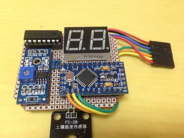 1, caja auriculares de Apple 2, Arduino pro mini 3, sensor de humedad de suelo 4, 74HC595 shifter 5, 2 dígitos LED (polo negativo común) 5, resistencia de 330 ohmios X 2 6, algunos cables