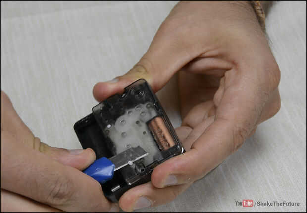 Corte cualquier botones e interruptores, así que usted puede poner la base sobre la mesa con el lado de la batería hacia abajo.