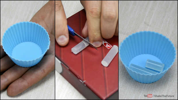Cortar un trozo de la cola de un palillo del pegamento y colocarla en un molde de silicona.