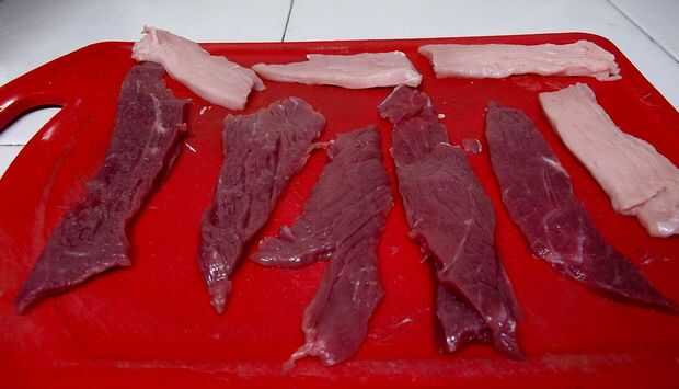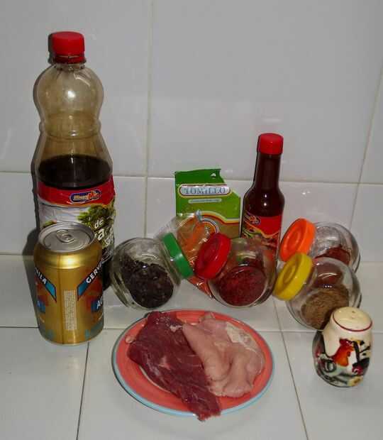 Limpia y quitar la grasa de la carne, cortar en tiras finas 1/4 de pulgada de espesor y 1 pulgada de ancho (medidas no estrictas). Preparar la marinada, en este caso compré un adobo para la carne que contiene la mayor parte de los ingredientes ya incluidos y he añadido la salsa inglesa, una pizca de sal, cerveza y un poco de miel. Te recomiendo usar un adobo previamente hecho para simplificar el trabajo. Ponga la carne con el Adobe en el refrigerador durante unas 12 horas.