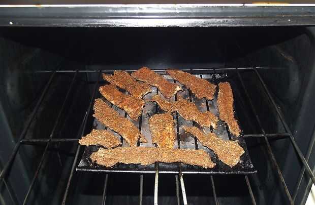 Coloque la carne en una parrilla y llevarlo al horno a 140-160 ° F durante aproximadamente 4 horas, dejando la tapa del horno ligeramente abierta para liberar la humedad. Compruebe con regularidad para voltear la carne y secar uniformemente.