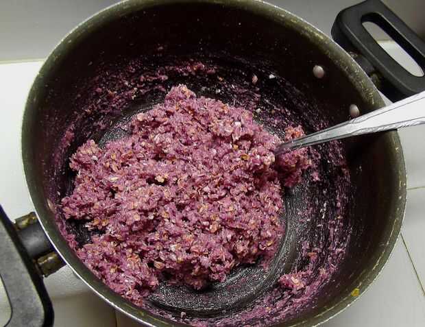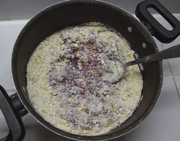 Después hervir la gelatina, mezclar con la mezcla seca con una cuchara o con una batidora eléctrica. Podría ser un poco difícil de mezclar bien al principio, usted podría agregar agua si la mezcla está demasiado seca, pero sólo un poco!