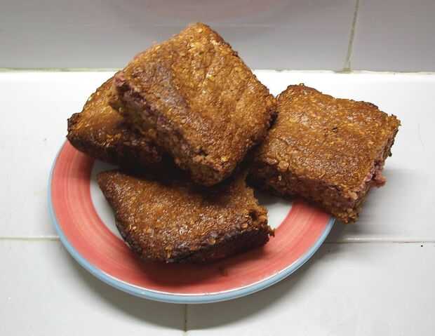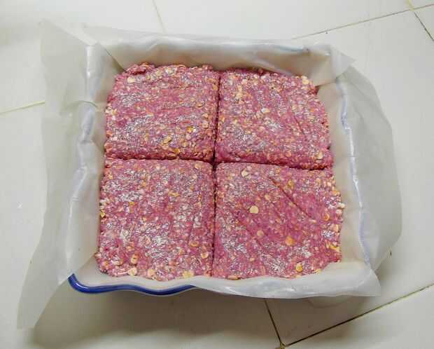 Una vez que tenga una consistencia suave, poner y presionar la masa en un molde rectangular forrado con papel de pergamino y llevar a horno durante aproximadamente 1 hora a ~ 200° F. Si tienes un deshidratador, se puede utilizar también, pero prefiero los horneados.