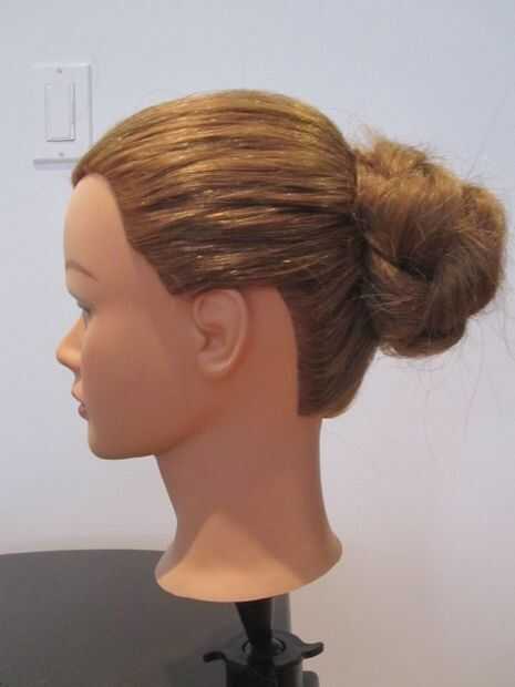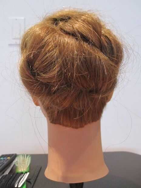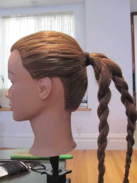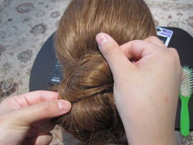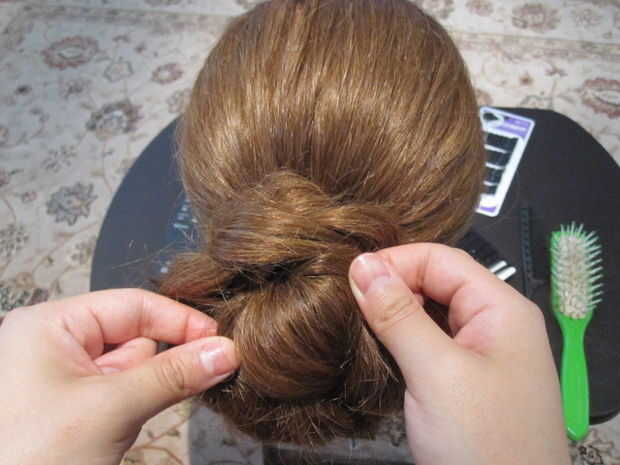 Una sección de viento hacia la derecha, y el otro hacia la izquierda, alrededor de la base de la cola de caballo y pin en su lugar.