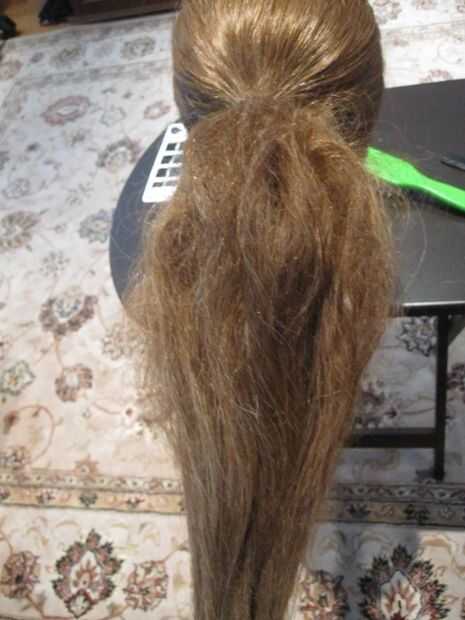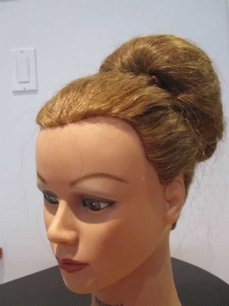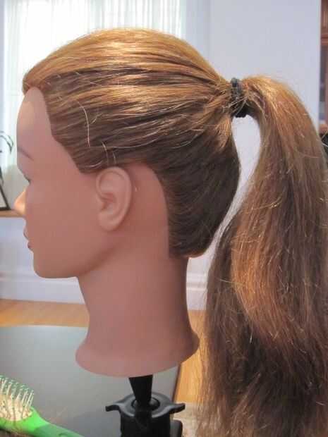 Sujetando la cola de la cola de caballo en una mano, sin apretar un nudo y Remétala bajo el pelo en la parte superior de la cabeza, creando un abanico de pelo. Con alfileres, fije el ventilador en el lugar donde está el nudo.