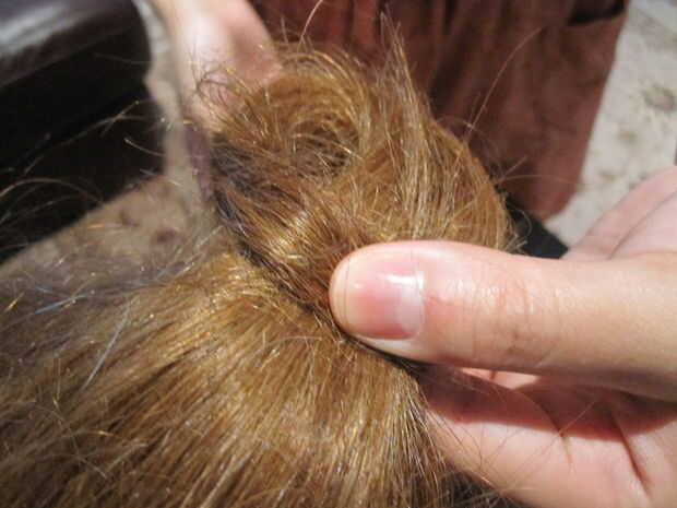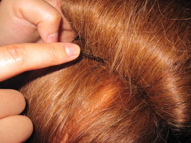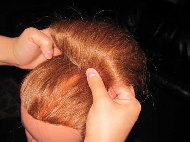 Con los dedos, ventilador el pelo un poco más los los lados del ventilador son tocar el lado de la cabeza y pin los lados en su lugar.