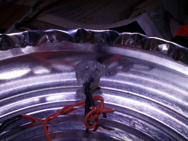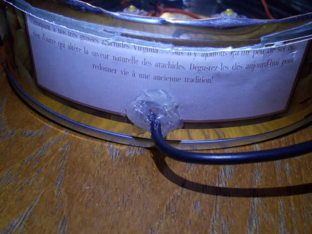Para mantener el cable en su lugar, perfore un agujero en la lata para el cable. Con el cable a través del orificio, agregar suficiente pegamento caliente alrededor de él.