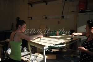 Luego aplicamos pegamento Mod Podge para la mesa de estructura de tabla