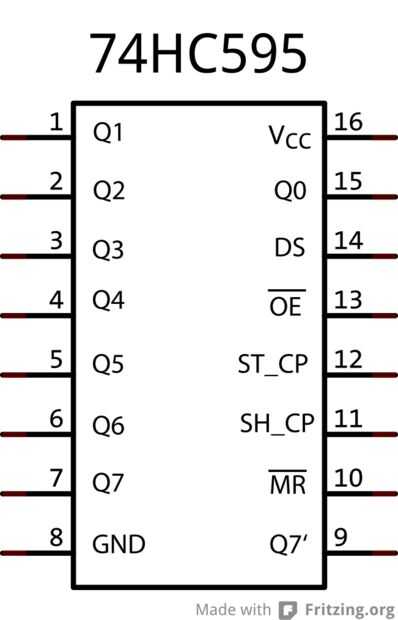 En viene el chip 74HC595. Esto es muy barato y fácil de operar el registro de desplazamiento. En esencia lo que hace es tomar en una señales de reloj y de datos que utiliza para rellenar un búfer interno de 8 bits con los 8 últimos bits que han 'entrados'. Una vez que ha señalado la clavija de 'Enganche' (ST_CP) 'alta' se mueve estos bits en sus 8 salidas. La 595 tiene una característica muy agradable, tiene una serie de datos pasador (Q7'), este pin puede usarse para encadenar 2 o más 595 de juntos para formar la serie adaptadores paralelo que son 16 o más bits de ancho. Para este proyecto necesitamos 2 de estos chips. El esquema también puede ser modificado para trabajar con un solo modo de 4 bits en 595, pero esto no ser cubierto por este tutorial.