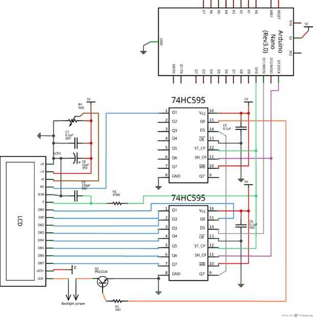 Lo que vemos aquí es que el fondo 595 es conducción pines de datos de la pantalla LCD en una configuración de 8 bits, el chip superior controla la señal RS y la retroiluminación por activar un transistor o desactivar. Recuerde la *Nota acerca de la retroiluminación de la LCD en saber su página hardware #1, en el caso de tu LCD no tiene una resistencia de luz de fondo, no olvide agregar en su circuito. En mi caso las pantallas LCD ya vine con una resistencia incorporada, así que me salté este paso.