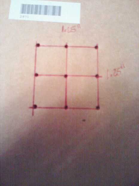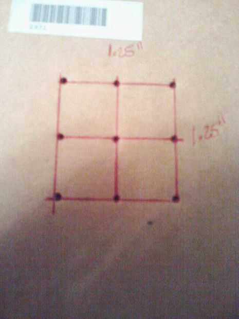 Para la construcción de las capas del cubo, utiliza una pequeña caja dibujando sobre ella un cuadrado de 1,25 "x 1.25" y entonces se puede dividir ese cuadrado en cuatro partes y así obtener los nueve lugares para los nueve LEDs que quiero poner y soldarlos.