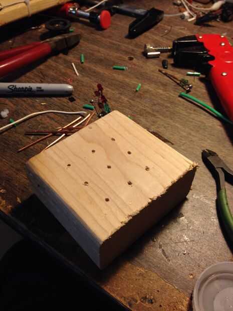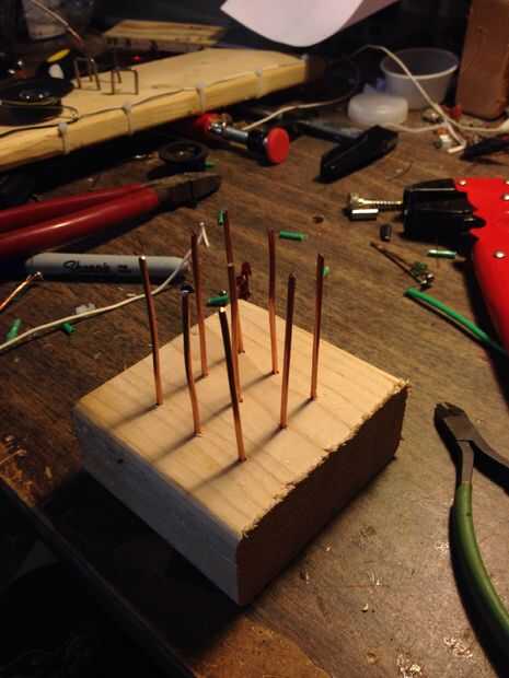 Para hacer la base necesita una paz de madera y agujeros del mismo tamaño que los cables verticales. Todos los cables de corriente vertical son tierra