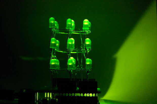 por favor votar en el concurso de resplandor:) es un cubo de led muy sencillo que no necesita un ARDUNIO al programa. Parpadea 512 diversos patrones antes de reiniciar.PIEZAS> madera (suficiente para hacer la base)> soldadura> 27 led de> un ic