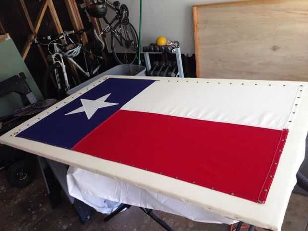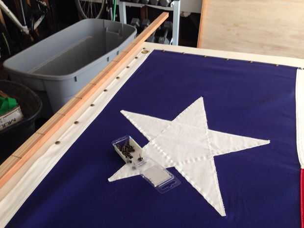 Después de cavar hacia fuera la tela cubierto marco interno de su caja fuerte oculta manchas, le di un rápido una vez con una plancha. Hice lo mismo con la bandera. Utilicé .5in tapicería color peltre clavos para colocar la bandera en el marco interno. Si desea obtener realmente de lujo, podría coser en su lugar, pero no tengo tiempo para que el negocio (o habilidades). Los clavos de tapicería dan un aspecto rústico agradable a todo aunque.